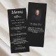 Cartão de menu de festa de aniversário. Personalize e adicione um nome, idade, data e menu. Um fundo negro. Letras brancas coloridas. Voltar: adicione uma foto da cara de aniversário, fatos divertidos