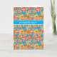 Um cartão de aniversário bonito com o cumprimento em Galês e all over em um teste padrão de flores vermelhas, alaranjadas, amarelas em um fundo brilhante dos azul-céu, de uma colagem de papel pintado à mão por Judy Adamson.