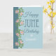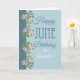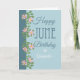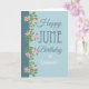 Um Cartão de Aniversário de Junho bonito para personalizar, com uma fronteira de Dogroses cor-de-rosa sobre um fundo azul de dois tons; parte da coleção Posh & Painterly "Rosy Posy".