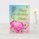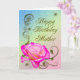 Uma rosa rosa elegante em um plano de trabalho de rolagem de ouro. Um belo cartão que certamente agradará à sua mãe no seu aniversário.