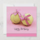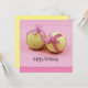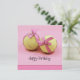 Cartão de aniversário de tênis com bola de tênis sobre fundo rosa com faixa rosa