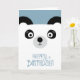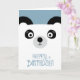 A ilustração do urso panda, bonito, com fundo azul e o encantador texto "Parabéns".