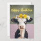 O cartão de aniversário engraçado apresenta vaca branca com coroa floral e saudação de aniversário neon. Personalize com sua própria mensagem atrás.