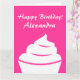 Cartão de aniversário grande da extra grande para mulheres, personalizado com nome. Cartão de aniversário doce desproporcionado enorme do cupcake. Os desejos de Personalizable e os doces femininos picam a cor do fundo. Cartão gigante do XL com design do bolo do copo. Cor-de-rosa de néon e branco.