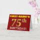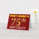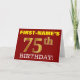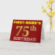 Este design de cartão de saudação de aniversário apresenta uma mensagem como "FIRST-NAME'S 75th BIRTHDAY!", com o "75º" a ter uma aparência falsa e imitada de cor dourada. O nome do destinatário na frente pode ser personalizado, e o fundo frontal é vermelho colorido. Também apresenta uma mensagem de saudação de aniversário personalizável no dentro. Um cartão de cumprimentos de aniversário como este talvez pudesse ser dado a alguém em comemoração dos seus setenta e cinco anos. [~Z0000184]