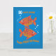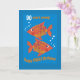 Um cartão de aniversário do 90 do divertimento para um Piscean, com os dois peixes amarelos alaranjados e dourados brilhantes em um fundo azul brilhante, de uma colagem de papel pintado à mão por Judy Adamson. Se você não vê a idade que você precisa, você pode gostar de saber que há uma versão dianteira feita sob encomenda deste cartão de aniversário.