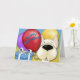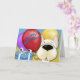 Adorável Bulldog Francês Grande Nariz com um presente de aniversário e segurando balões em sua boca. Balão lê Rappy Rirthday!