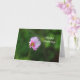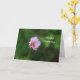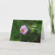 A imagem fotográfica de um wildflower cor-de-rosa do cosmos em um fundo da folha verde macia borrada imprimiu em um cartão de aniversário.