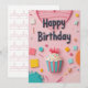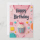 Este cartão de aniversário alegre apresenta um design branco com um coração cor-de-rosa listrado, um confete colorido, e um cupcake maravilhosamente decorado com glacé chicoteado e borrachas arco-íris. Colocado sobre um fundo cor-de-rosa suave com sotaques geométricos divertidos, o texto "Parabéns" pop em letras azuis em negrito. Perfeito para crianças, adolescentes ou qualquer pessoa que ame doces e vibrações alegres e brilhantes para comemorar.