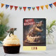 Um cartão de aniversário assustador com um bolo de aniversário de dinossauros na frente com "Feliz Aniversário", bonés negros. Personalize a frente adicionando seus nomes. O dentro da placa apresenta espaço para a sua mensagem escrita ou manuscrita.