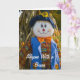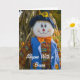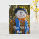 Este espantalho feliz sorri em você de um remendo ensolarado da abóbora, apoiado por um cornstalk seco. Tem uma cara branca do tecido com os olhos, o nariz e a boca tirados sobre e o cabelo da palha coberto por um chapéu azul de pano que ostenta uma flor amarela. Veste uma camisa de xadrez azul e alaranjada, com uma veste azul e um laço alaranjado. Eu tomei esta foto, um símbolo da colheita e do tempo do Dia das Bruxas, em picareta-seu-próprio remendo da abóbora em Puyallup, WA. Copyright Gail Storrs 2009.