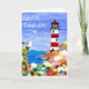 Um cartão de aniversário com uma colagem de papel pintada à mão de uma cena costeira com um farol. Veja também presentes e roupa correspondentes.