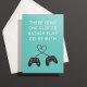 Perfeito para o casal que joga juntos, este texto frontal do cartão de aniversário azul aqua diz "não há mais ninguém com quem eu preferencialmente jogue em cooperação" e o dentro "feliz aniversário para o meu jogador favorito dois." Dois controladores pretos do console são conectados com um cabo em forma de coração. Este cartão de boas-vindas em papel é uma maneira divertida de celebrar o aniversário do seu amante de jogos.