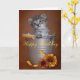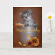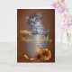 Um cartão de aniversário com uma foto de um gatinho do gato malhado com cores do outono