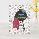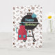 Envie desejos de aniversário com este cartão ousado e divertido! Apresentando uma grelha preta com o texto "Feliz Aniversário!", rodeada por um padrão de carne, pizza, canecas de cerveja, e mais, esta carta é perfeita para qualquer pessoa que adora disparar o CHURRASCO. dentro de vazio para a sua própria mensagem — ideal para alimentos, pais ou chefs de quintal.