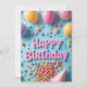 Este cartão de aniversário brilhante e alegre contém as palavras "Feliz Aniversário" em letras cor-de-rosa, rodeadas por balões coloridos, lollipops, confetti e um lindo chapéu de festa em forma de cone. Uma cascata de derramares doces vibrantes sobre um fundo azul divertido, criando uma vibração alegre e festiva. Perfeito para as crianças, amantes dos dentes doces, ou qualquer um que goste de celebrações divertidas, de temas doces e de uma energia de festa brilhante.