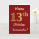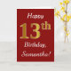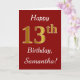 Este simples cartão de aniversário apresenta a mensagem "Feliz 13 de Aniversário", com o "13" a ter uma aparência falsa de ouro. Também apresenta um nome personalizado e um fundo vermelho escuro. Pode ser dado a alguém que comemora o seu décimo terceiro aniversário.