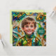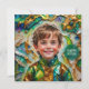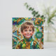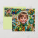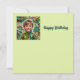 A carta apresenta um jovem feliz e seus amigos dinossauros. A saudação é "Feliz Aniversário". O verso tem uma pequena versão da imagem frontal e muito espaço para escrever uma mensagem. O AI Bing prestou assistência na criação do cartão.