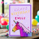 Cartão de Aniversário Feliz, Colorido Colorido, Da Unicórnio. Vem com um belo desenho de unicórnio colorido arco-íris e um texto Feliz aniversário. O unicórnio está sobre um fundo cor-de-abstrato rosa com padrão estelar. Adicione seu nome e dentro de texto.