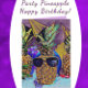 Este abacaxi da festa está pronto para a celebração do aniversário. Esportivo, óculos escuros e cores brilhantes e alegres, esta fruta tropical divertida irá gerar sorrisos por toda a parte. As cores de destaque neste design são mauve, violeta, roxo magenta, cobalto e azul ártico, sol tucano e amarelo canário. A saudação dentro diz: Que seu dia especial seja cheio de diversão excelente e seu ano cheio de felicidade verdadeira. Não se esqueça de adicionar o Mês e o Ano na parte traseira do cartão.