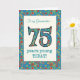 Um Cartão de Aniversário específico da Idade bonito para uma avó de setenta e cinco anos, com o número 75 e a fronteira preenchida com um padrão floral retrô colorido num fundo de chá. O padrão floral é parte da coleção 'Impressão de avó' Posh & Painterly, de uma colagem de papel pintada manualmente por Judy Adamson. Este design ajustado todos os tamanhos da placa de saudação.