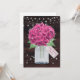 Cartão de aniversário floral cor-de-rosa doce, de cor roxa, com hydrangeas cor-de-rosa e um jarro de dentro de hálito de bebê contra um fundo de madeira rústica. As lanternas e as estrelas cintilantes adicionam um charme mágico a este design floral fofo. Um crachá floral com texto personalizado 'Feliz Aniversário' na frente e um grande coração floral com uma mensagem no verso.