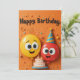 Este cartão de aniversário lúdico apresenta dois balões animados - um amarelo e um vermelho - sorrindo alegremente acima de um bolo festivo com velas. O fundo laranja está cheio de confete colorido e minúsculas decorações, enquanto o texto peculiar "Parabéns" adiciona à diversão, com uma segunda linha humoramente embaralhada. Perfeito para crianças ou qualquer pessoa com um espírito amoroso, este cartão é ideal para desejos de aniversário alegres e alegres.