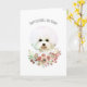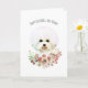 Um cartão de boas-vindas com uma ilustração de uma Frise de Bichon. Textos personalizáveis. Perfeito para o amante do cão ou dono do Bichon Frise.