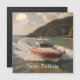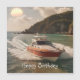 Este cartão de aniversário magnético apresenta um barco a motor a cruzar numa praia.