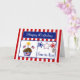 Este cartão de aniversário patriótico fará seu sorriso militar do genro. Este cartão colorido caracteriza um fundo listrado vermelho e branco, o cupcake do chocolate com estrelas, bandeiras americanas, um coração da bandeira e uma vela, umas estrelas do vermelho, as brancas & as azuis, um Tag de cão gravado com os "EUA" e uma bandeira azul com o texto "feliz aniversario" no branco. dog tags do ©2015 & cartões militares das botas de combate pela xerez Harris