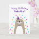 Cartão de aniversário para Babushka. Se você chama sua avó Babushka em vez de vovó, este cartão de aniversário é perfeito para ela. (Babushka significa avó em russo.) Sua babushka vai adorar o design bonitinho, moderno, colorido, ao estilo escandinavo que apresenta um ursinho de pelúcia castanho e cinza com um chapéu de festa roxo e boliche e um confete rosa, amarelo e azul com o texto "Feliz aniversário, Babushka!" Torne este cartão personalizável! Clique em "Editar Design", "Dentro Inferior/Direita: Texto e imagens", "Texto" e "Adicionar texto" para escrever a sua própria mensagem personalizada e personalizada no dentro Babushka!