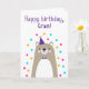 Cartão de aniversário para Gran. Se você chama sua avó Gran em vez de vovó, este cartão de aniversário é perfeito para ela. Sua avó vai adorar o design bonito, moderno, colorido, ao estilo escandinavo, desse cartão de aniversário, que apresenta um ursinho de pelúcia castanho e cinza com um chapéu de festa roxo e boliche e um confete rosa, amarelo e azul com o texto "Feliz aniversário, avó!" Torne este cartão personalizável! Clique em "Editar Design", "Dentro Inferior/Direita: Texto e imagens", "Texto" e "Adicionar texto" para escrever a sua própria mensagem personalizada e personalizada no Gran dentro!
