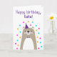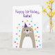 Cartão de aniversário para Kaka. Se você chama seu avô Kaka em vez do vovô, este cartão de aniversário é perfeito para ele. (Kaka significa avô em Hausa.) O seu kaka vai adorar o design do estilo escandinavo, bonito, moderno, colorido, deste cartão de aniversário, que inclui um ursinho de ursinha castanho e cinza com um chapéu de festa roxo e boliche e um confete rosa, amarelo e azul com o texto "Feliz aniversário, Kaka!" Torne este cartão personalizável! Clique em "Editar Design", "Dentro Inferior/Direita: Texto e imagens", "Texto" e "Adicionar texto" para escrever a sua própria mensagem personalizada e personalizada no dentro Kaka!