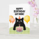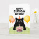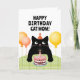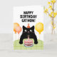 Cartão de aniversário para mãe de gato com gatinho preto, bolo de aniversário e balões.