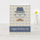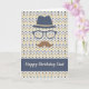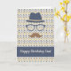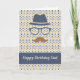 Cartão de aniversário para o dia com fundo de bolinhas creme, azul, marrom e amarelo, chapéu, óculos e bigode. Obrigados à Hungryjpeg para alguns dos elementos do design.