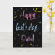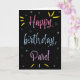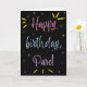 Você chama seu pai de Pare, não de Papai. (Pare significa pai em catalão e vêneto.) Imagine como o Pare ficará animado ao receber um cartão de aniversário dirigido especialmente a ele! Seu pare também vai adorar o design colorido inspirado em fogos de artifício (amarelo, rosa, azul e roxo em fundo preto) que diz "Feliz aniversário, Pare!"
