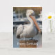 Este cartão de aniversário tem um pelicano descansando em um posto numa marina.