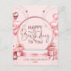 Cartão de aniversário personalizado apresentando uma celebração cor-de-rosa festiva com "Feliz Aniversário para Você!" com balões e presentes cor-de-rosa, personalizado com seu nome e data, e rosa claro em ambos os lados.