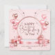 Cartão de aniversário personalizado que apresenta uma festiva celebração rosa com "Parabéns a você!" com balões e presentes cor-de-rosa, personalizados com seu nome e data, e rosas claro em ambos os lados.