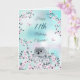 Coruja coruja em um fundo de turquesa sob galhos e borboletas cor-de-rosa. Com um texto de aniversário feliz e personalizado para os aniversários das meninas.