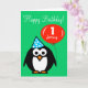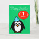 Cartão de Aniversário Personalizado | Pinguim com chapéu de festa e balão vermelho. Design de desenho animado bonito com número de idade personalizado. Querida 1rua, por exemplo. Um menino ou menina de um ano.