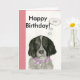 Spaniel preto e branco bonito com o cartão de aniversário cor-de-rosa do colar da fita, tirado por Eilidh Berwick que teve severo MIM desde a infância. Todos os direitos me vão pesquisa.
