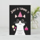 Um cartão de convite de aniversário fofo que apresenta uma ilustração com a cabeça de um gato preto e branco sobre fundo preto, com um chapéu de festa rosa, bailes e um bolo de aniversário. O texto no cartão é personalizável.