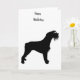 Cartão de aniversário Shadow Schnauzer. Fundo branco com a silhueta de um Schnauzer a preto. Texto "Parabéns". A dentro da placa está limpa para que possa ser personalizada com a sua própria mensagem pessoal.