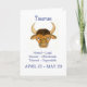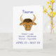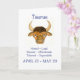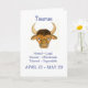 Um cartão de aniversário para qualquer nascer sob o signo de Taurus, o touro. A imagem é de uma pintura aquosa de Judy Adamson e o texto, em caracteres azuis, é "Taurus", seguido das datas e principais traços positivos de um tureão. A saudação dentro, que é personalizável, é "Feliz Aniversário!"