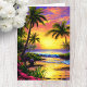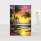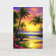 Cartão de aniversário tropical com um pôr do sol espetacular, palmeiras e ondas do oceano. Personalize com seu próprio ditado, se quiser.