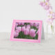 O cartão de aniversário é mostrado a rosa com um impressão de fotos de tulipas cor-de-rosa bonito. Personalize este cartão ou comprar como está. Adicione seu próprio dentro de desejo especial ou vazio de comprar. Imagem licenciada