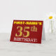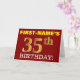 Este design de cartão de saudação de aniversário apresenta uma mensagem como "PRIMEIRO NOME DO 35º ANIVERSÁRIO!", com o "35º" a ter uma aparência falsa e imitada de cor dourada. O nome do destinatário na frente pode ser personalizado, e o fundo frontal é vermelho colorido. Também apresenta uma mensagem de saudação de aniversário personalizada no dentro. Um cartão de cumprimentos de aniversário como este talvez pudesse ser dado a alguém em comemoração do seu trigésimo quinto aniversário. [~Z0000184]