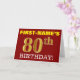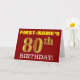 Este design de cartão de saudação de aniversário apresenta uma mensagem como "PRIMEIRO NOME DO 80 DE ANIVERSÁRIO!", com o "80" a ter uma aparência falsa/imitada de cor dourada. O nome do destinatário na frente pode ser personalizado e o fundo frontal é vermelho colorido. Também apresenta uma mensagem de saudação de aniversário personalizada no dentro. Um cartão de cumprimentos de aniversário como este talvez pudesse ser dado a alguém em comemoração do seu oitavo aniversário. [~Z0000184]