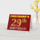 Este design de cartão de saudação de aniversário apresenta uma mensagem como "PRIMEIRO NOME'S 29º ANIVERSÁRIO!", com o "29º" a ter uma aparência falsa/imitada de cor dourada. O nome do destinatário na frente pode ser personalizado, e o fundo frontal é vermelho colorido. Também apresenta uma mensagem de saudação de aniversário personalizável no dentro. Um cartão de aniversário como este talvez pudesse ser dado a alguém em comemoração do seu vigésimo nono aniversário. [~Z0000184]